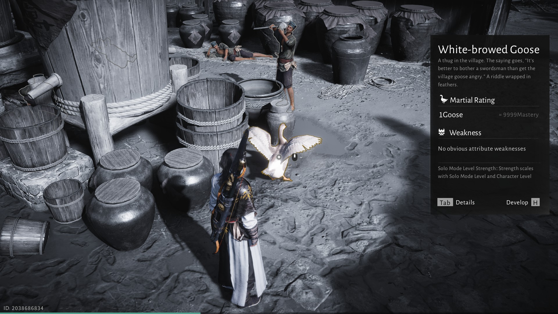 - inspecting a goose reveals its martial rating as 9999, and there is an actual boss goose that fucks you up and cannot be damaged, at least I couldn't; eventually I figured out the only way to beat him is to freeze his meridians and yeet him into the river with Tai Chi (this vaguely feels like some novel reference)