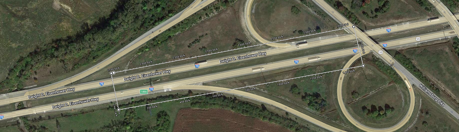 Check out this example. The band is 1500 feet long and less than 350 feet wide, so it should be fine, right? Wrong. The engineer should adjust the north and south edges so that they cut across the ramps perpendicularly rather than obliquely. And the east edge of this suggested band is quite egregious, because its placement probably will lead to nasty slivers of area (1) at the end of the ramp and (2) in the milling to maintain the clearance under the bridge. Much better alternatives are this or this, or even this (1500′×700′—just one band for the entire sheet) if you're doing work on the other highway as well. And it only gets worse when you're working on a land-service highway, with zillions of intersections and driveways that you probably don't want to cut into confusing little slices, rather than on a freeway that just has ramps and structures to worry about. Maybe an automated sheet-layout program could do something half-decent on the basis of baselines and manually-entered road widths, but the engineer usually won't draw baselines for minor side streets, and never will draw baselines for driveways. It's simpler for the engineer to just do the layout himself from the beginning.