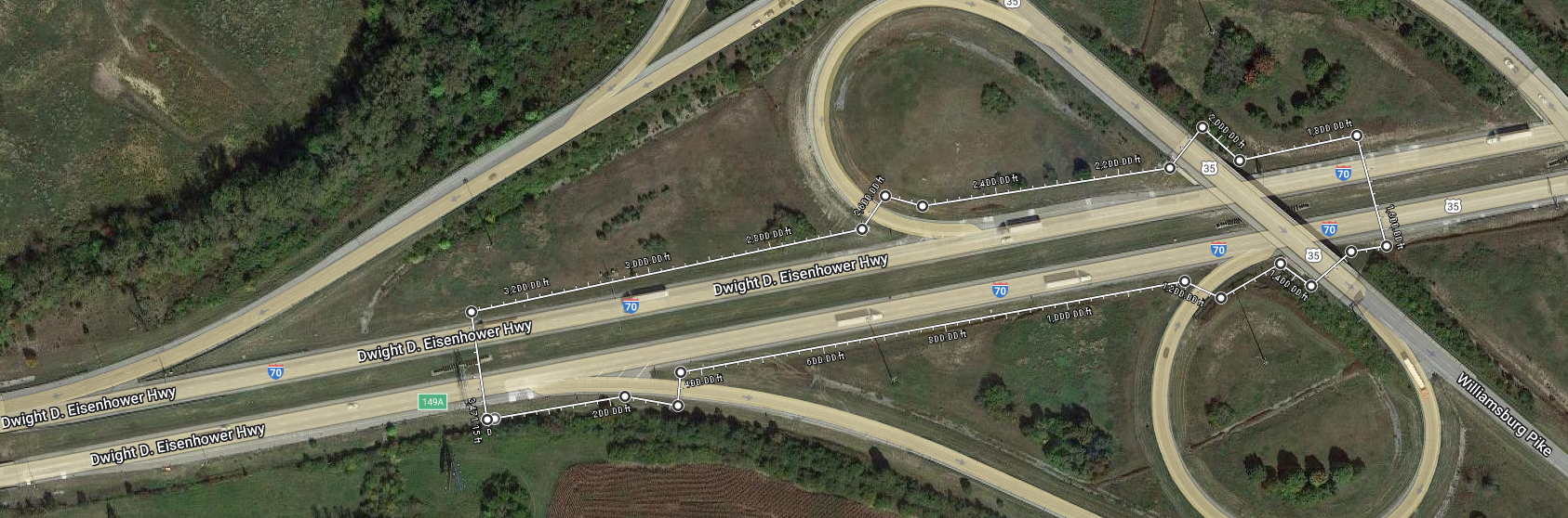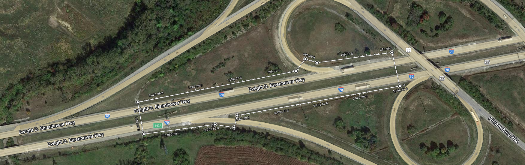 In contrast, the latest project assigned to my office has a length of fifty miles spread across ten non-intersecting segments of six highways, and has around 1600 individual stripes. (The new project has fewer stripes per mile because it's mostly on two-lane cross sections and includes no interchanges, while the "unusually large" project was mostly on six-lane cross sections and included several interchanges. In terms of lane-miles, it's an increase from 55 to 120.)