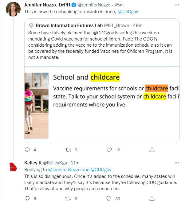 [Contemporaneous discussion here]. This one particularly bugs me because it was really bad work from the CDC, and either Twitter put a CDC slide deck referencing a preprint above their own ability to do math, or (to steelman) wanted the debunking of a bad study blocked for general trust or virtue of silence reasons. It's good that this wasn't in the list of things that the Biden team was forcing, but it's not so good to find out that it actually hit a human for review.