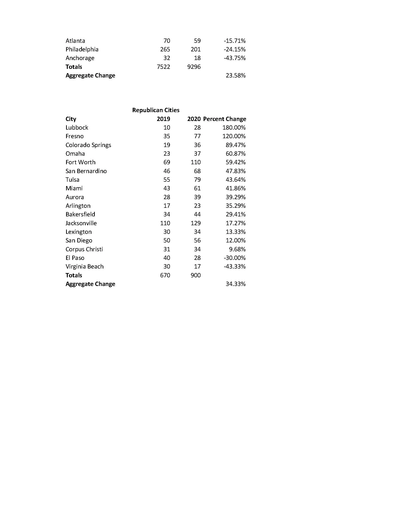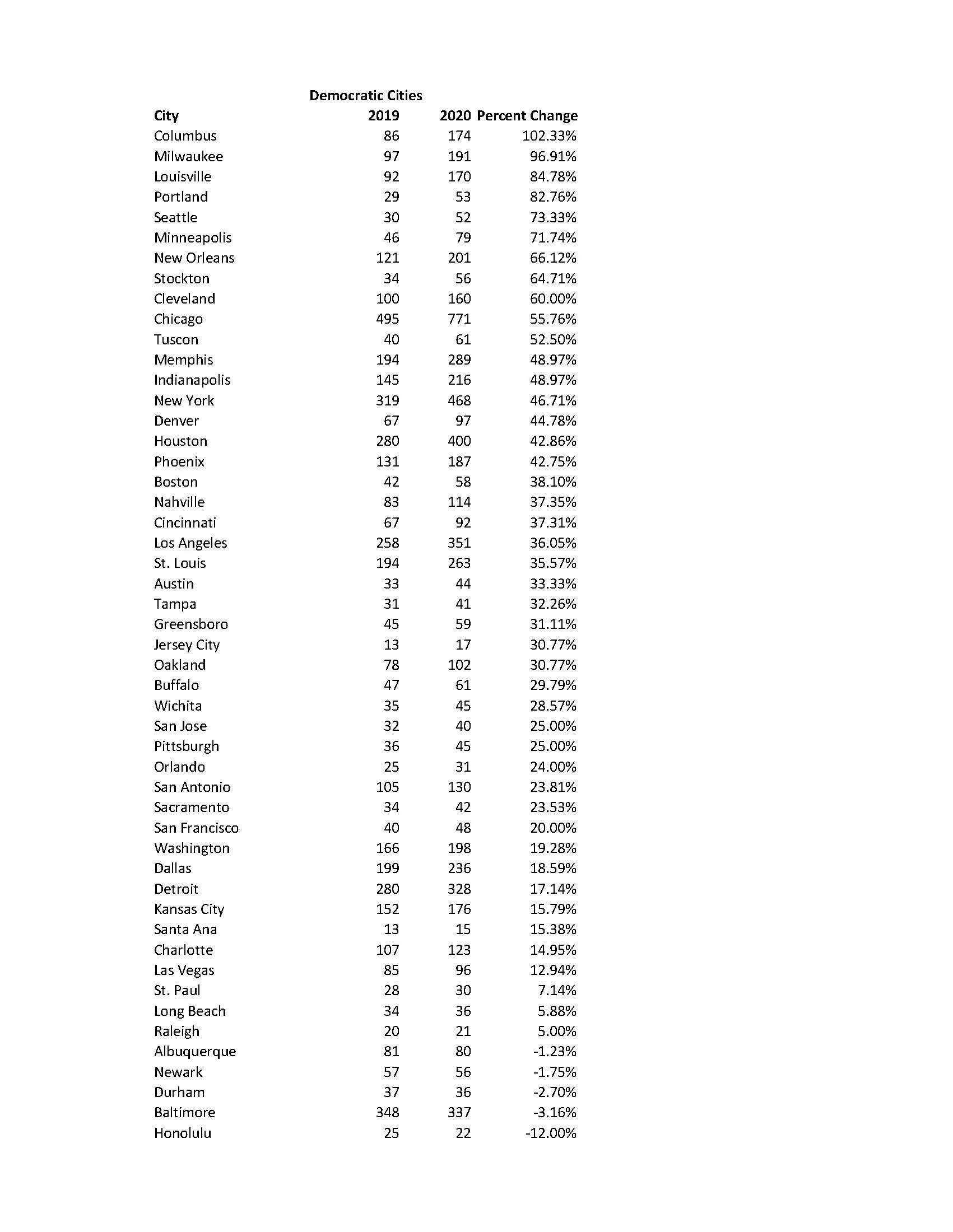 I got them from City Data because that was the only place that had most of these statistics compiled in one place, though I admit that I double-checked some numbers that looked suspicious and found errors, and some of it was incomplete so I pulled it from city websites and newspaper accounts. If someone has better data or can find any other errors, by all means, let me know. I reran the numbers with your updates (and updated 2019 numbers as well since I assumed the errors weren't isolated) and the new total for D cities is 26.83%, higher than it was, but still significantly lower than the R number.
